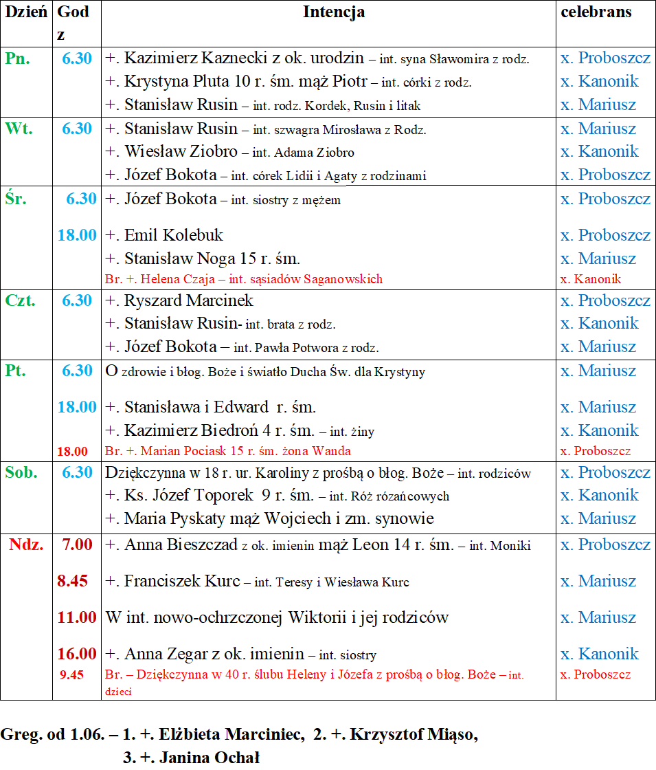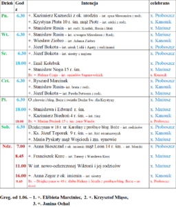 poniedziałek Godzina Intencja Celebrans 7:00 +. Marian Chodak i bracia Józef i Stanisław x. Proboszcz 8:45 Dziękczynna…